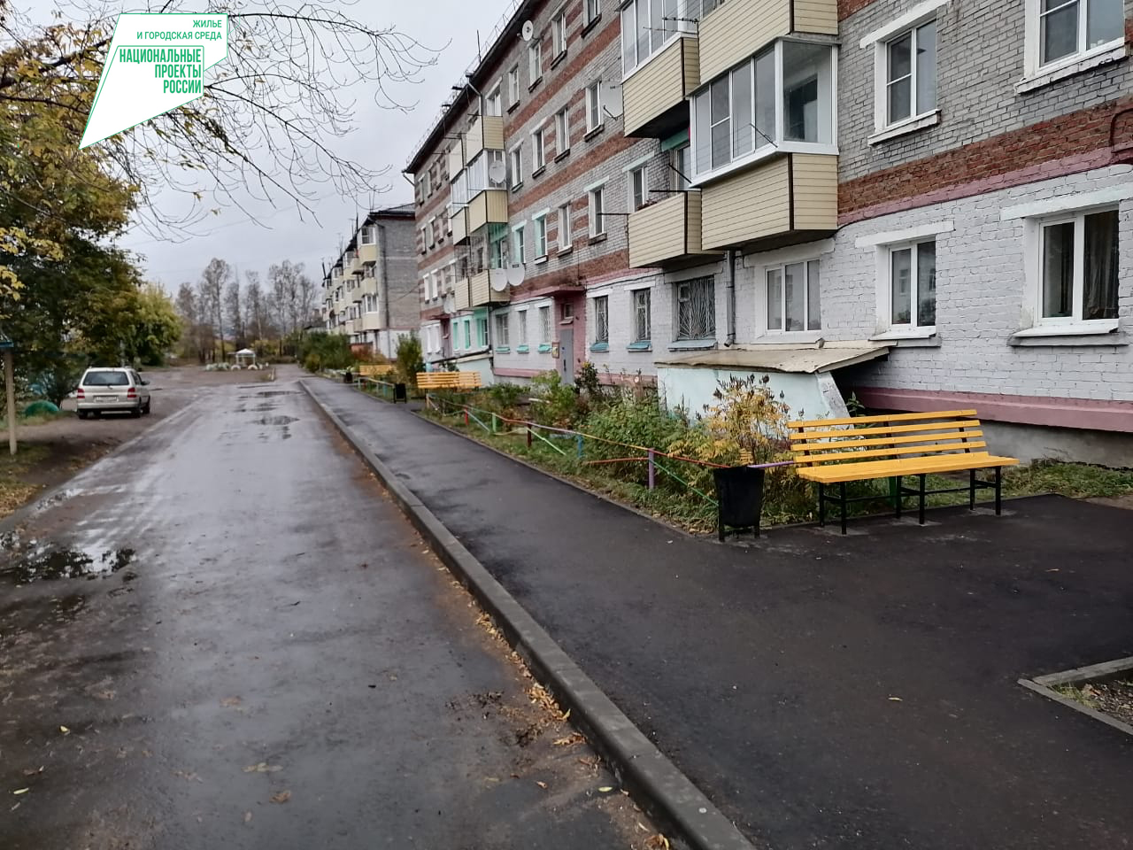 Подрядной организацией уже заасфальтированы все проезды и тротуары, установлены урны и скамейки, дополнительно провели устройство плитных тротуаров возле подъездов, продолжаются работы по установке освещения, столбы уже поставлены, осталось протянуть провода. Работы выполнены на — 90%.