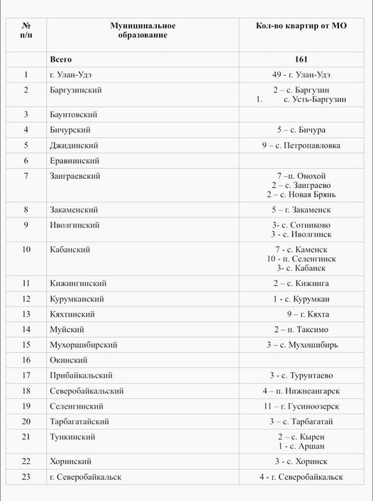 Управление капитального строительства в 2022 году планирует приобрести 161 квартиру для детей-сирот сразу в большинстве муниципальных образований Бурятии. Так, по состоянию на февраль 2022 года Управлением запланированы покупки квартир в г. Улан-Удэ, Баргузинском, Баунтовском, Бичурском, Джидинском, Еравнинском, Заиграевском, Закаменском, Северобайкальском и многих других районах республики. Подробная информация о количестве планируемых к приобретению квартир в конкретных населенных пунктах размещена в следующей таблице.О начале торгов желающие продать квартиры могут узнать на сайте ЕИС. Номера извещений и стоимость жилых помещений будут опубликованы на официальных аккаунтах УКС ПРБ в социальных сетях и районных СМИ. Следите за обновлениями и не упустите возможность продать свою квартиру и подарить уютный дом детям-сиротам.