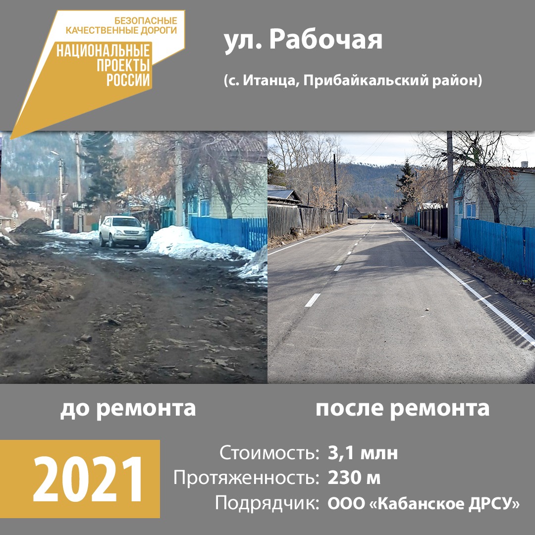 «Благодаря дорожному нацпроекту в селе Итанца преобразилась улица Рабочая, которая ведет к фельдшерско-акушерскому пункту. Дорога находилась в ненормативном состоянии: асфальт изношен, повсюду трещины и разрушения, в адрес администрации постоянно поступали жалобы от населения. Наши дороги становятся лучше, будем работать в этом направлении» - отметил Сергей Семенов, глава МО «Прибайкальский район».