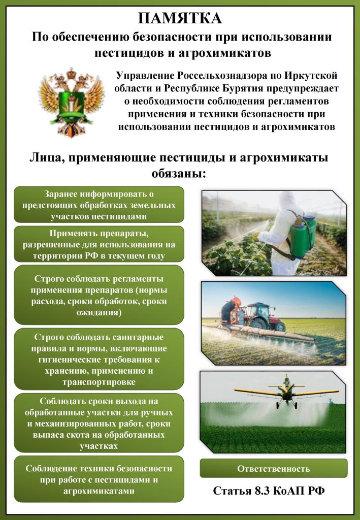 Безопасность применения пестицидов и агрохимикатов обеспечивается соблюдением установленных регламентов и правил применения пестицидов и агрохимикатов, исключающих их негативное воздействие на здоровье людей и окружающую природную среду.В целях неукоснительного исполнения норм Федерального закона от 19 июля 1997г № 109-ФЗ « О безопасном обращении с пестицидами и агрохимикатами», а также СанПиН 1.2.2584-10 «Гигиенические требования к безопасности процессов испытаний, хранения, перевозки, реализации, применения, обезвреживания и утилизации пестицидов и агрохимикатов» до обработок пестицидами сельхозугодий, не позднее, чем за 3 дня, ответственные сельхозтоваропроизводители за проведение работ должны обеспечить оповещение о запланированных работах население близлежащих населенных пунктов через средства массовой информации.На границах обрабатываемых пестицидами площадей устанавливаются щиты с указанием информации «Обработано пестицидами», содержащие информацию о мерах предосторожности и возможных сроках выхода на указанную территорию. Специалисты, которые непосредственно организуют выполнение работ по химической защите растений и животных и принимают в них участие, должны иметь опыт работы в этой области, специальное образование или курсовую подготовку.Отравления животных и накопление остаточных количеств пестицидов в их организме происходят в результате неправильного применения химических средств защиты животных от внешних паразитов, при поедании животными растений, содержащих остатки пестицидов, протравленного зерна, при использовании воды из загрязненных водоемов, при скармливании корма в таре из-под пестицидов. Угроза отравления птиц и рыб возникает при использовании стойких препаратов и нарушении правил их применения, хранения и транспортировки, когда возможен контакт с пестицидами, смытыми в водоемы, при несоблюдении санитарных зон, при авиационно - химических работах.При проведении обработок сельскохозяйственных животных и птицы с последующим использованием продукции животноводства и птицеводства на пищевые цели, должны соблюдаться установленные регламенты (нормы расхода препаратов, кратность и сроки обработок) и сроки ожидания, определяющие безопасность продукции для здоровья населения и окружающей среды.Должно быть назначено ответственное лицо за транспортировку, применение и хранение пестицидов и удобрений, за выдачу нарядов-допусков на выполнение работ повышенной опасности. Не допускается бестарное хранение ядохимикатов. Ядохимикаты должны храниться в неповрежденной таре с соответствующими этикетками, в отдельном закрытом помещении, расположенном на расстоянии не ближе 200 м от животноводческой фермы. В этом помещении должен быть и весь инвентарь, используемый для приготовления и применения ядохимикатов. В таких помещениях нельзя хранить какие-либо корма. Не допускается транспортировка ядохимикатов вместе с кормами, пищевыми продуктами.