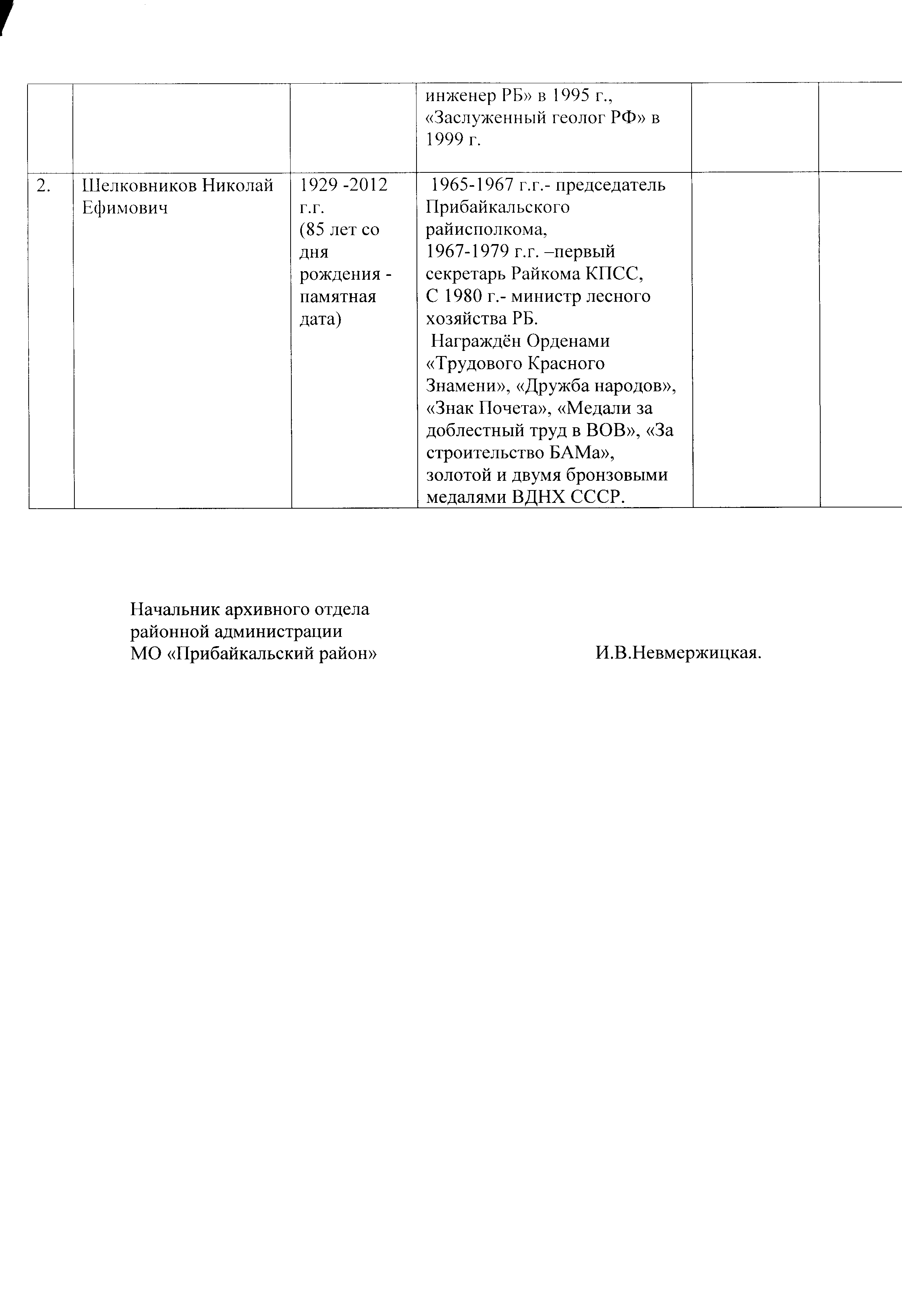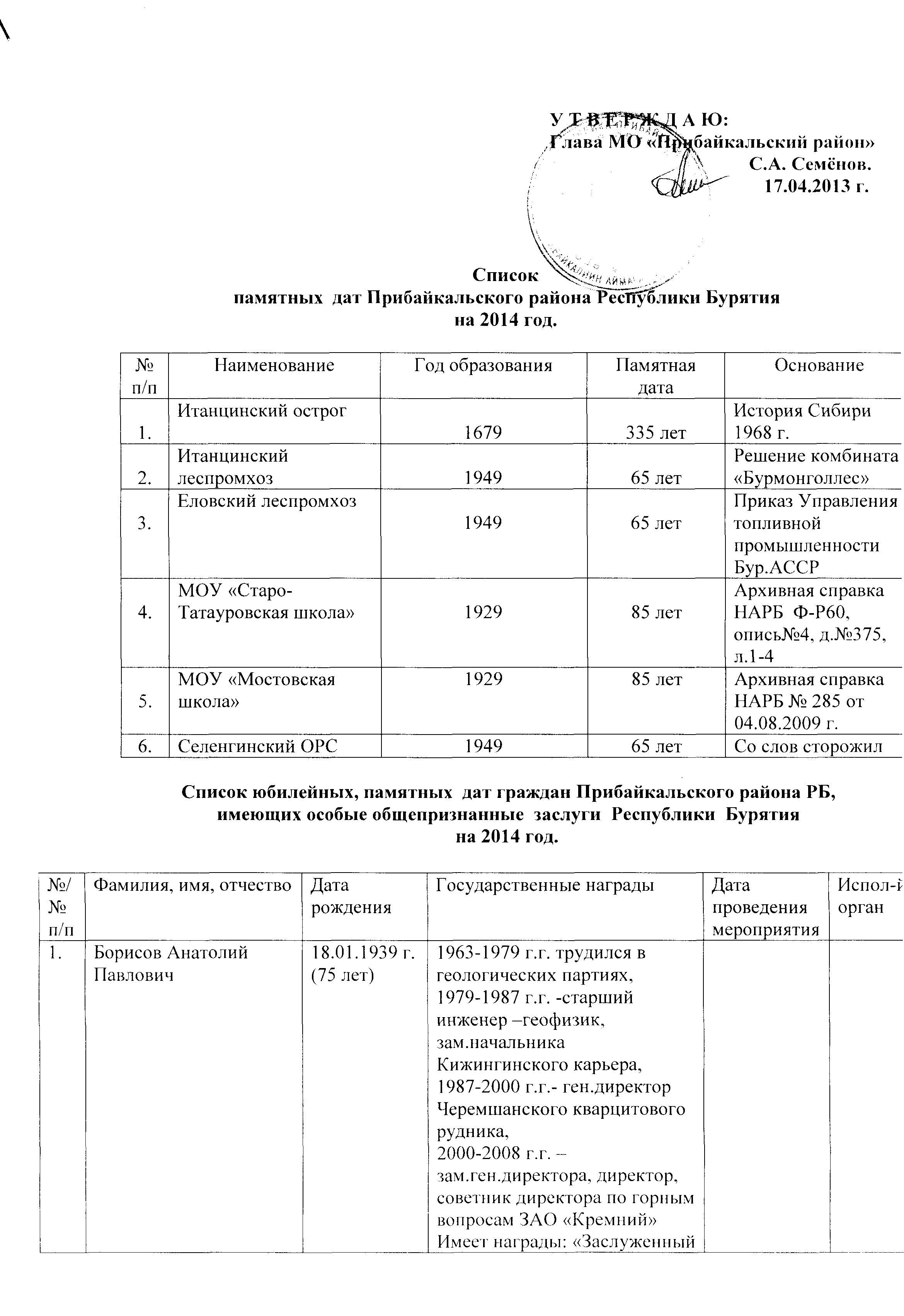 Список юбилейных и знаменательных дат по организациям, предприятиям и учреждениям Прибайкальского района Республики Бурятия